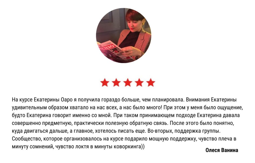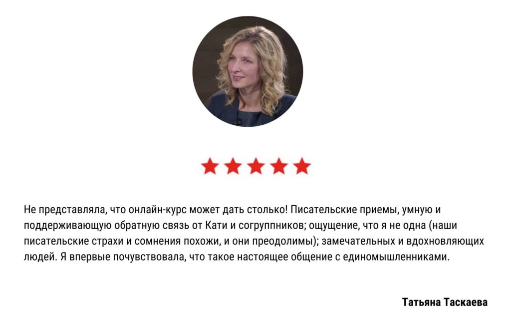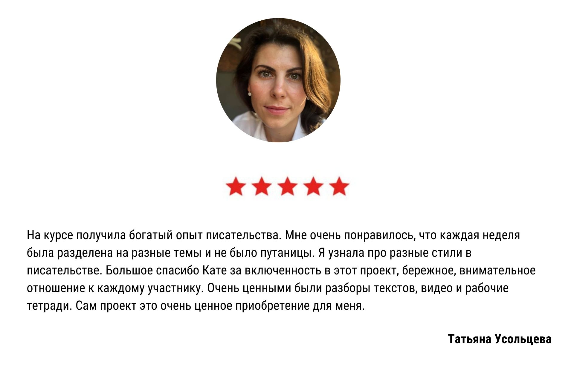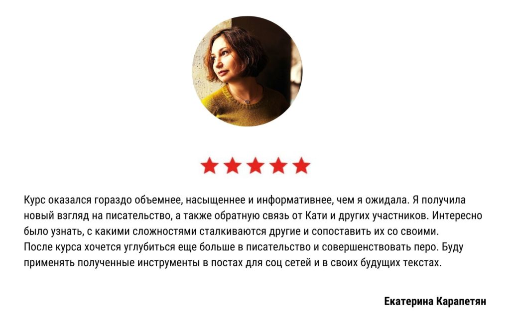 Мне очень понравились примеры и задания, предложенные Катей. Мастерская максимально прикладная и дает импульс для дальнейшего продвижения в писательстве.
