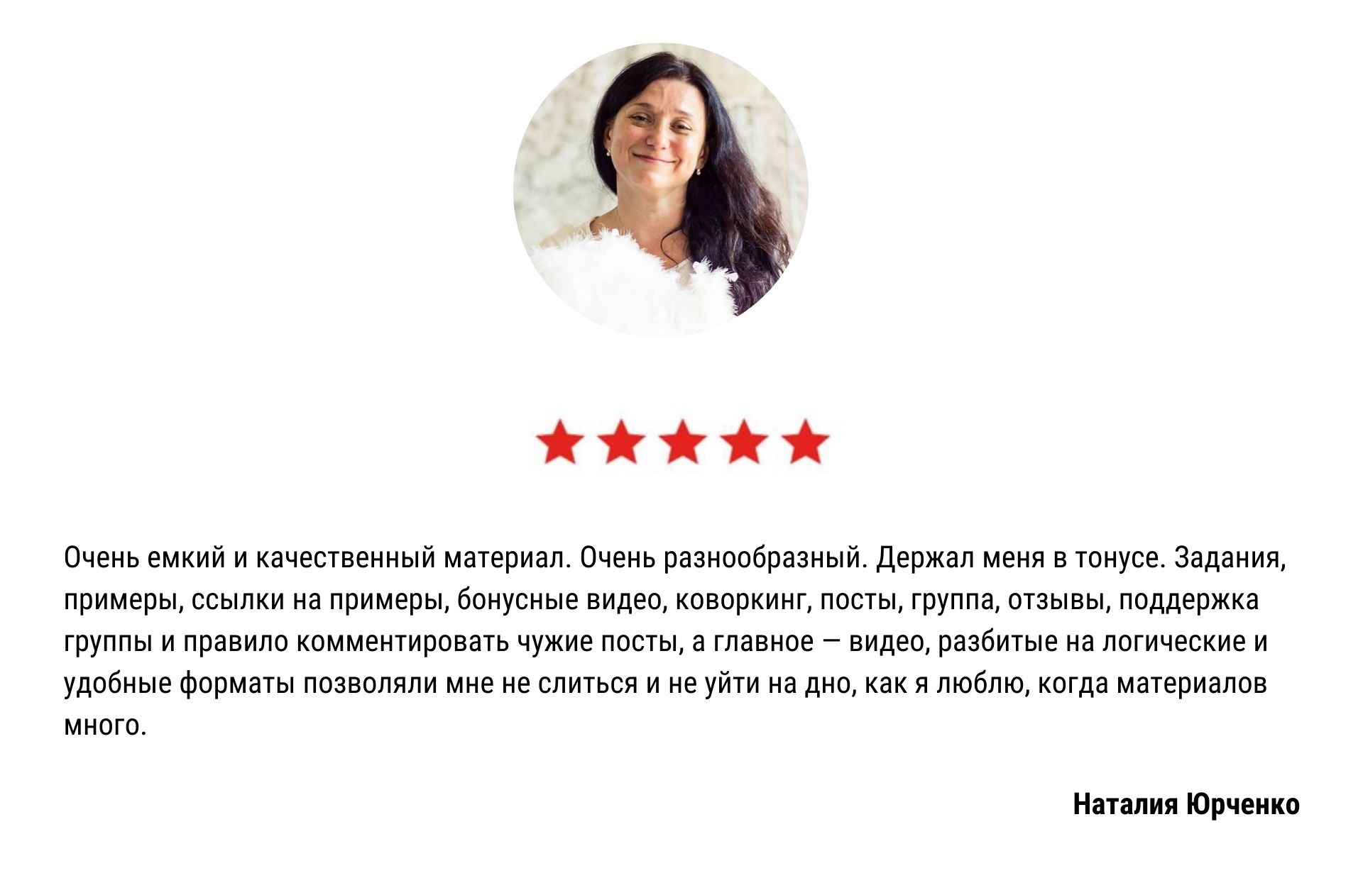 Помогало применение приемов на практике сразу на месте; возможность посмотреть в чате, как другие это делают: сразу видно, правильно ли ты понял материал. А также открываются новые углы зрения – то, о чем ты сам бы не подумал, другому человеку тут же пришло на ум – это вдохновляет.