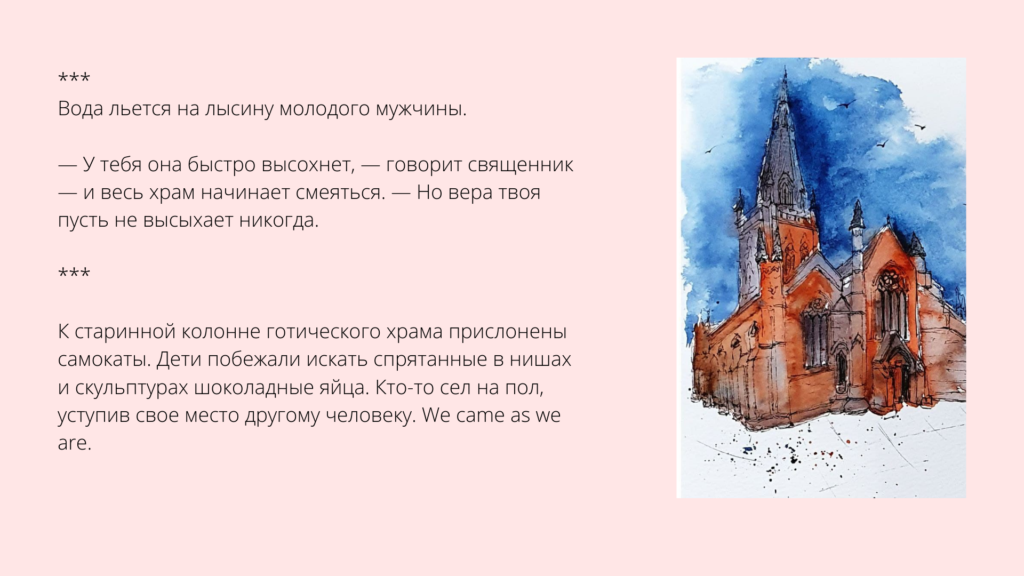 Бесконечно благодарна Екатерине и кураторам. Мне кажется, что-то изменилось внутри меня. Я каждый раз вступаю на новый путь писательства, когда прихожу работать с Катей.