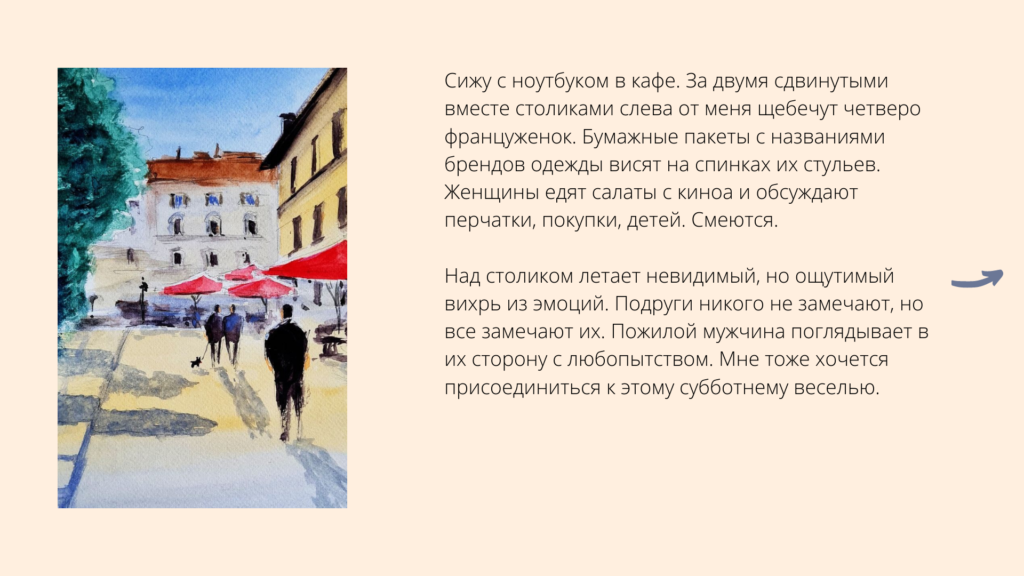 Я приглашаю вас на пленэр вместе со мной. Это легкий курс, замешанный на удовольствии от ловли жизни в ваш писательский сачок. В нем не будет ничего длинного, масштабного, неподъемного, требующего часов сидения на стуле. Но вы заметите, как разовьется ваш слух, станет более зорким глаз и натренируется рука.