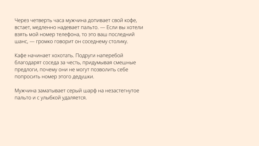 Синтаксис — это ритм текста, его дыхание. А еще синтаксис — это управление временем с его параллельностью событий или причинно-следственными связями между ними. Потренируемся в этом скетче писать плоско и объемно, используя предложения разных типов.