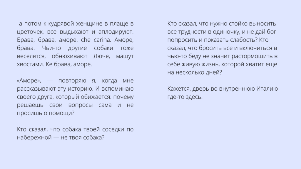 Иногда я записываю сцену, произошедшую на моих глазах в кафе, и публикую ее в инстаграме – и этот пост оказывается самым популярным. А через год-другой он находит место в новой книге.